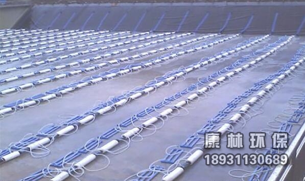 管曝氣單元是懸掛鏈?zhǔn)狡貧庀到y(tǒng)的核心,其靠自重沉于水下;漂浮布?xì)夤芷∮谒嫔希廛浌芡ㄟ^閥門與將漂浮布?xì)夤芘c供氣干管相連,將壓縮空氣引入漂浮布?xì)夤埽偻ㄟ^懸掛軟管將空氣引入橡膠膜管曝氣單元,通過橡膠膜管上的微孔以小氣泡的形式釋放,完成曝氣過程。一條漂浮布?xì)夤苌习惭b有若干套橡膠膜管曝氣單元,形成一條曝氣鏈,曝氣鏈橫跨曝氣池兩岸,一座曝氣池需安裝多條曝氣鏈。